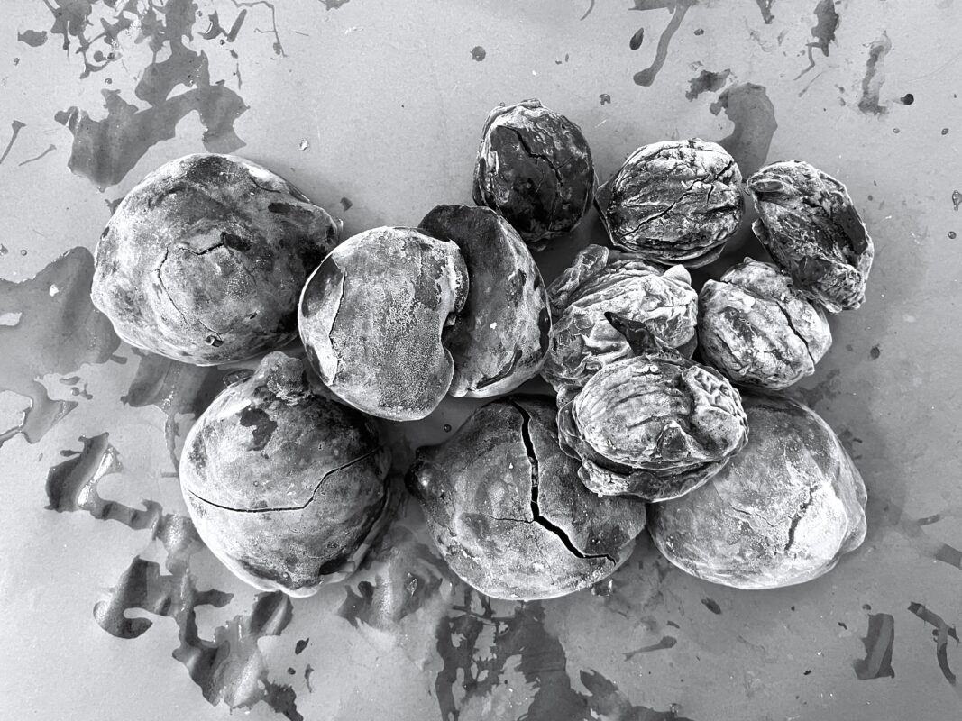Das beiliegende Bildmaterial zeigt einen variierbaren Ausschnitt des in Arbeit befindlichen Stilllebens und wird in vollendetem Maße einen gedeckten Tisch mit der Größe von etwa 1.5 x 4 Metern zeigen. Die ganze Tafel ist aus vielen einzelnen inFormen gegossenen Stücken aus gefrorener Tinte hergestellt und hernach zusammengesetzt.